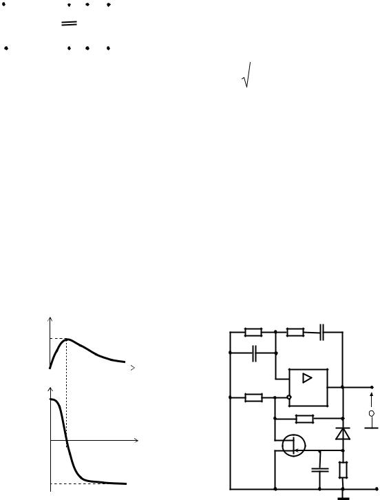 Графики амплитудно-частотной и фазочастотной характеристик цепи Вина приведены на рис. 14.12. Особенность их состоит в том, что на частоте f0 = 1 / 2πRC коэффициент передачи достигает максимального значения, равного 1/3, а фазовый сдвиг обращается в нуль. При включении схемы Вина в цепь положительной обратной связи операционного усилителя (рис. 14.13) на частоте f0 выполняется условие баланса фаз. Делитель R2, R1 в цепи отрицательной обратной связи задает коэффициент усиления неинвертирующего УПТ, равный
