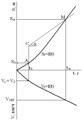 4. Для определения скорости в момент завершения обгона необходимо из точки tм опустить вниз перпендикуляр до пересечения с кривой V1= f(t), т.е. зависимостью «время-скорость» для обгоняющего ТС в момент завершения обгона - Vобг.