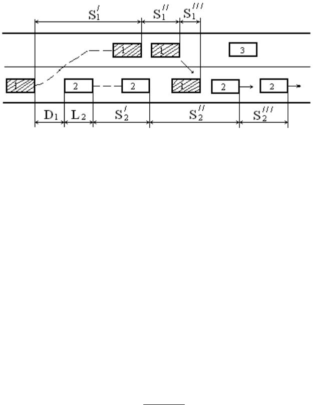 В начале незавершенного обгона (время t /) обгоняющий автомобиль, двигаясь со скоростью V1, выезжает на соседнюю полосу движения. Решив отказаться от обгона, водитель снижает скорость автомобиля до минимально устойчивой скорости V1/. Учитывая наличие опасности для движения, водитель тормозит обычно с максимальной интенсивностью (время t //). Затем, ведя автомобиль с минимально устойчивой скоростью, водитель пропускает вперед обгоняемый автомобиль и возвращается на прежнюю полосу (время t ///). Возможность выполнения такого маневра зависит как от тяговой, так и от тормозной
