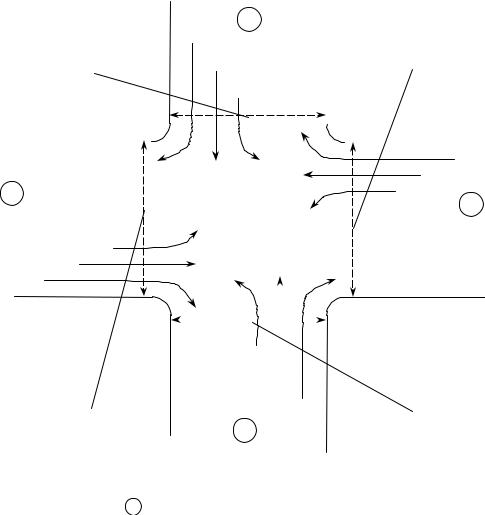 На рис. 2.3 показана пофазная организация движения потоков. Составление схем пофазного пропуска транспортных и пешеходных потоков выполняется с целью уменьшения числа конфликтов на перекрестке. Для этого все разрешенные потоки необходимо объединить в минимальное число групп неконфликтующих или допустимо конфликтующих потоков. Число групп будет равняться количеству фаз светофорного регулирования. В одной фазе пропускают обычно потоки со встречных подходов одной улицы. В этой же фазе парал-