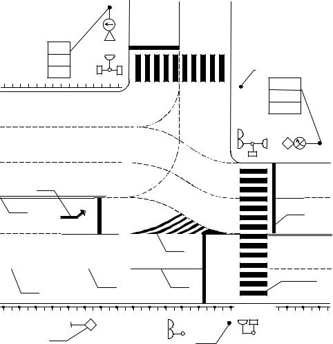 Размещение технических средств регулирования на перекрестке основывается на принятой организации движения. На схеме размещения технических средств регулирования все знаки и дорожная разметка маркируются в соответствии с ГОСТами (рис. 2.4).