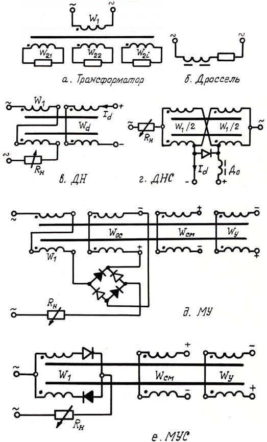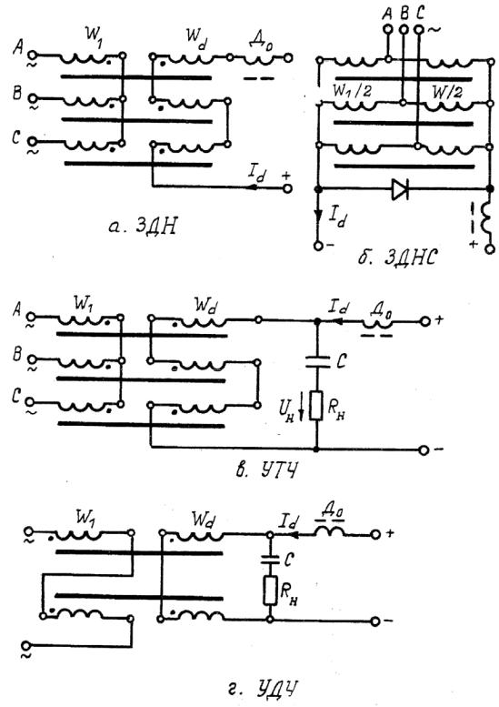 Дросселинасыщениятрехфазные(3ДН, 3ДНС) — рис. 2.1.3, а, б. Магнитный утроитель частоты (УТЧ) — рис. 2.1.3, в. Магнитный удвоитель частоты(УДЧ) — рис. 2.1.3, г.
