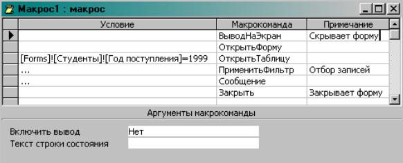 Если условие истинно, то выполняются макрокоманда, записанная в этой строке и в каждой следующей строке, содержащей в столбце Условие троеточие (…). Если условие ложно, то эти действия игнорируются и выполняется следующая за ними макрокоманда. Так, в примере (рис. 22) при истинном условии будут выполняться макрокоманды: «ОткрытьТаблицу», «ПрименитьФильтр», «Сообщение», а затем выполнится команда «Закрыть». При ложном условии сразу выполняется команда «Закрыть».