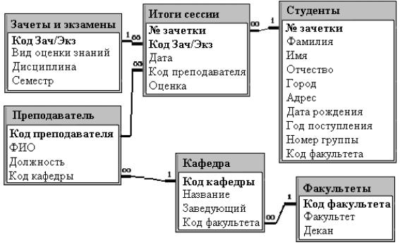 Для того чтобы не было повторяющихся записей, таблицы должны иметь уникальный индекс (первичный ключ). Пусть в первой таблице «Студенты» в качестве первичного ключа будет поле № зачетки, во второй таблице «Зачеты и экзамены» – поле Код зач/экз. В третью таблицу «Итоги сессии» добавим два поля № зачетки и Код зач/экз для связи с первой и второй таблицами, и в качестве первичного ключа возьмем эти два поля. После того, как мы разделили повторяющиеся объекты и определили ключевые поля в каждой таблице, база данных находится в
