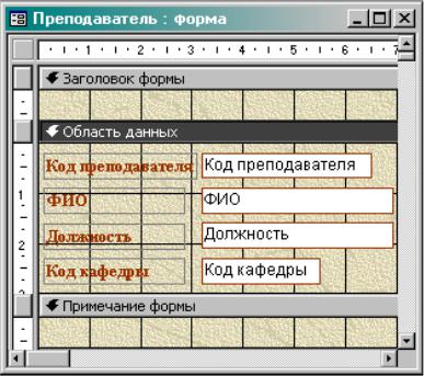 Основная информация в форме размещается в области данных. В этот раздел помещают поля исходной таблицы или запроса из списка полей.