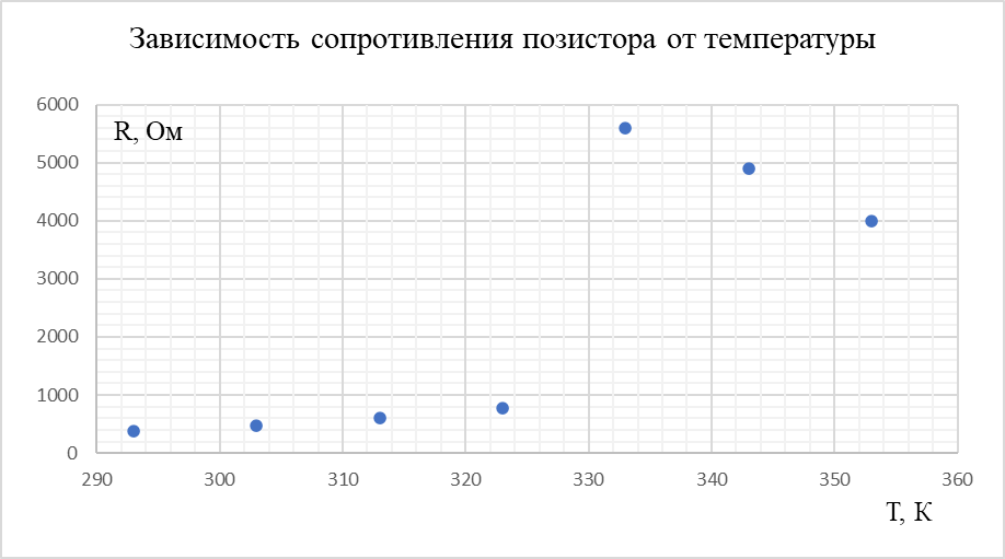 В ходе проделанной лабораторной работы были рассмотрены ВАХ термистора, позистора, варистора, а также зависимости R(T) для позистора и ln(σ)(1/T) для термистора (для позистора с возрастанием температуры сопротивление возрастает, т. к. αR >0, для термистора же наоборот уменьшается, т. к. αR <0). Были рассчитаны параметры для варистора β(А) = 4; βср ≈ 3,2; αR (U=const=20 В) ≈ -0,00392 К-1; αR (I=const=0,04 А) ≈ -0,00131 К-1 и для термистора коэффициент температурной чувствительности B ≈ 0,0001.