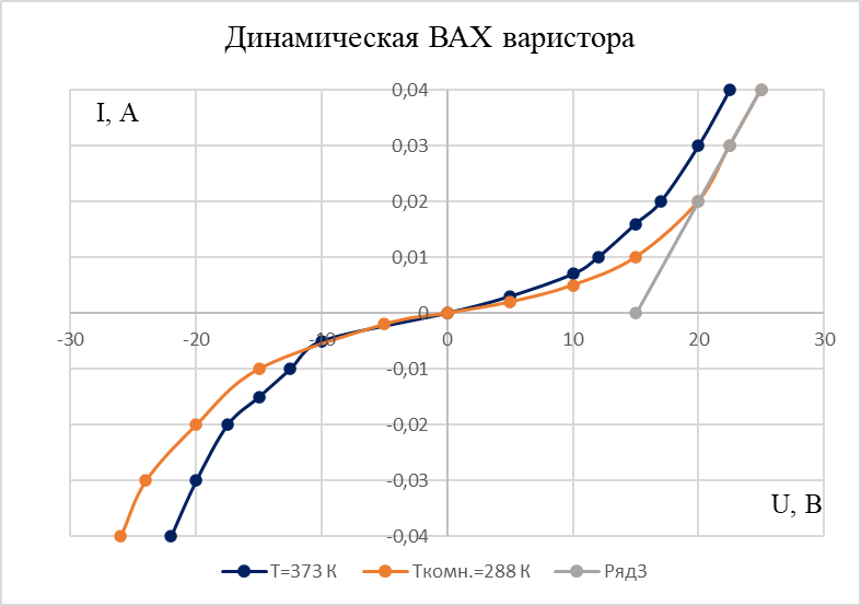 2. По осциллограмме ВАХ варистора вычислить коэффициент нелинейности варистора при комнатной температуре