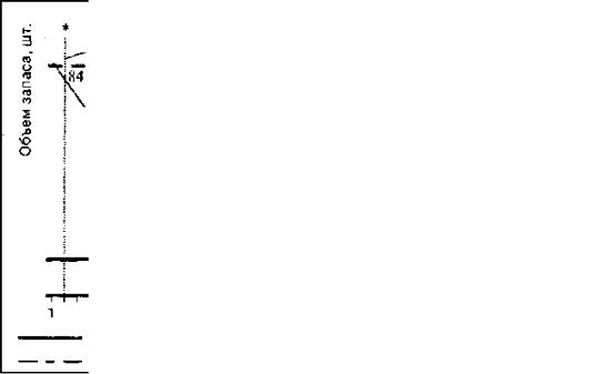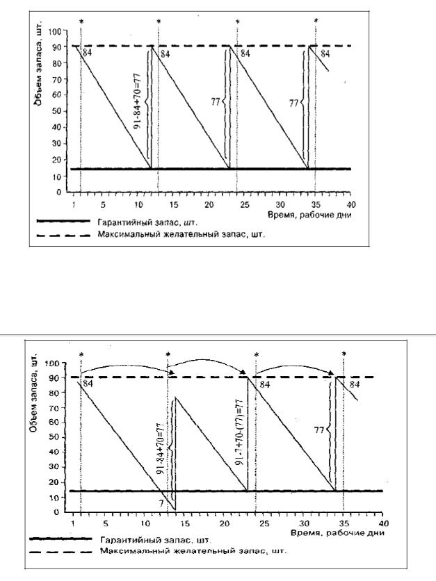 На рисунке 7.3 первая п оставка производится с задержкой, равной максимально возможной. Это приводит к и спользованию гарантийного запаса, и воз никает необходимость в его пополнении. Первый по ступивший заказ п о- полняет запас до уровня меньше порогового. При расчете размера второго заказа учет текущего запаса и размера не посту пившего еще первого заказа позволяет при поступлении второго заказа без задержек пополнить запас до максимального желательного уровня.