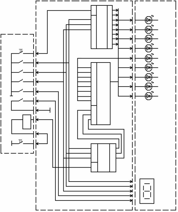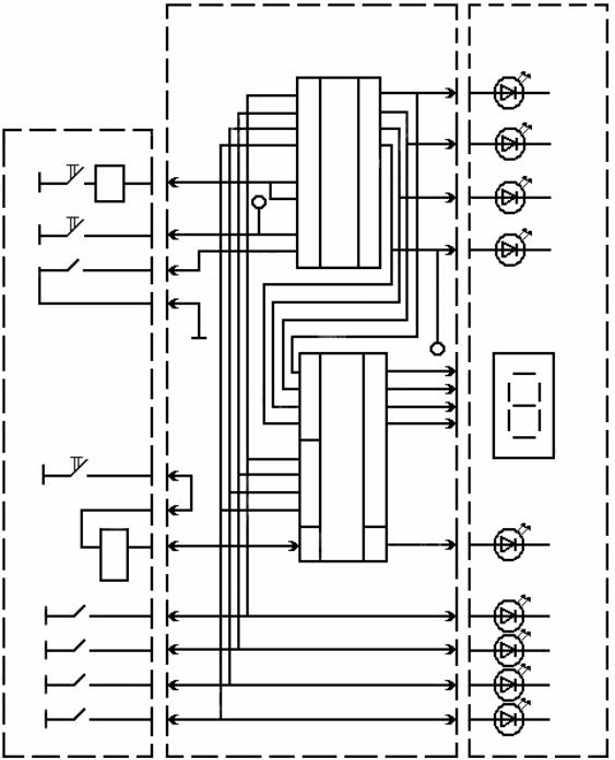 Плата используется при исследовании регистров и сумматоров. Принципиальная схема платы приведена на рис.4. Цифры по пунктирному контуру означают номера контактов на разъеме X1 (рис.1). Блоки индикации и управления относятся к блоку ввода-вывода информации.