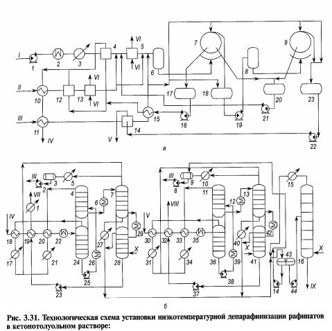 Технологическая схема установки двухступенчатой низкотемпературной депарафинизации в кетонотолуольном растворе приведена на рис. 3. 31.