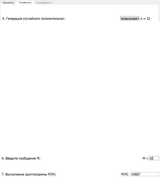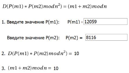 Для проверки гомоморфных свойств положим 1 = 3, 2 = 7, и зашифруем их по вышеописанному алгоритму (ключи и параметр k возьмем из расчетов выше).