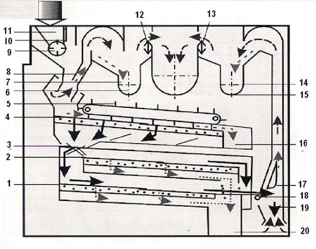 пневмосепаратора; 7, 14 – шнеки разгрузочные; 8 – пневмосепаратор предварительный; 9 – валец питающий; 10 – заслонка с грузом; 11 – устройство загрузочное; 12, 13 – регулирующие заслонки; 15 – камера осадочная главного пневмосепаратора; 16 – лоток крупных примесей; 17 – пневмосепаратор главный; 18 – заслонка-дозатор; 19 – сход