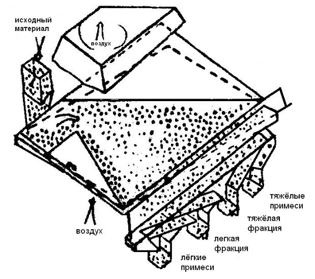 машины. Воздух проходит через фильтр, деку, зонт и поступает в воздуховод аспирационной системы. Обрабатываемый материал приходит в псевдоожиженное состояние при одновременном воздействии на него колебаний рабочей поверхности деки и воздушного потока. При этом материал приобретает свойства жидкости и частицы с большой плотностью (условно называемые тяжелыми) опускаются на поверхность деки, а частицы с малой плотностью