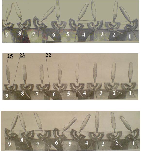 10 – рычаги поворотных шторок; 11 – сборники 1, 3, 5, 7, 9 фракций основных; 12 – сборники 2, 4, 6, 8 фракций промежуточных