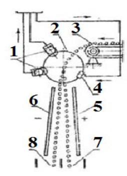 1 – фотоэлемент; 2 – круг оптический; 3 – транспортер; 4 – электрод заряжающий; |