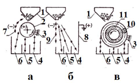 материал из бункера 1 (рис. 2.7, а) поступает на вращающийся барабан 2 с положительным зарядом. Соприкасаясь с поверхностью барабана, частица за-