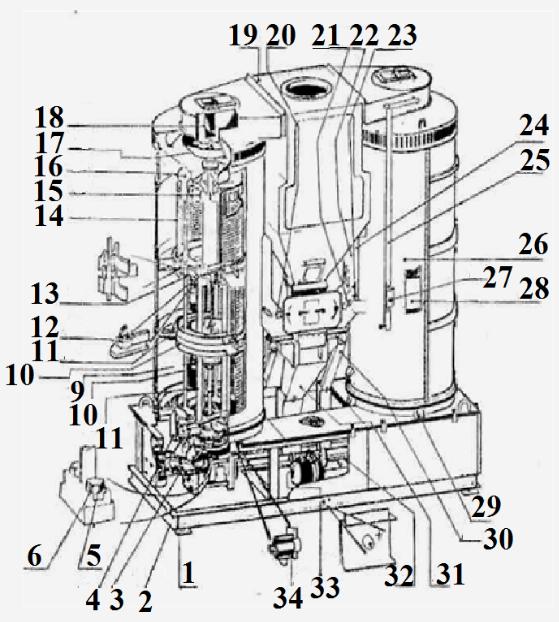 16 – обечайка; 18, 21 – клапаны; 19 – отстойник; 20, 22 – рычаги; 23 – фиксатор; 24 – сборник фракций; 25 – тяга; 26 – блок решетный; 28 – очиститель; 29 – болт; 30 – течка фуража; 31 – течка легких примесей; 32 – вал соединительный с муфтами; 33 – контрпривод вибратора