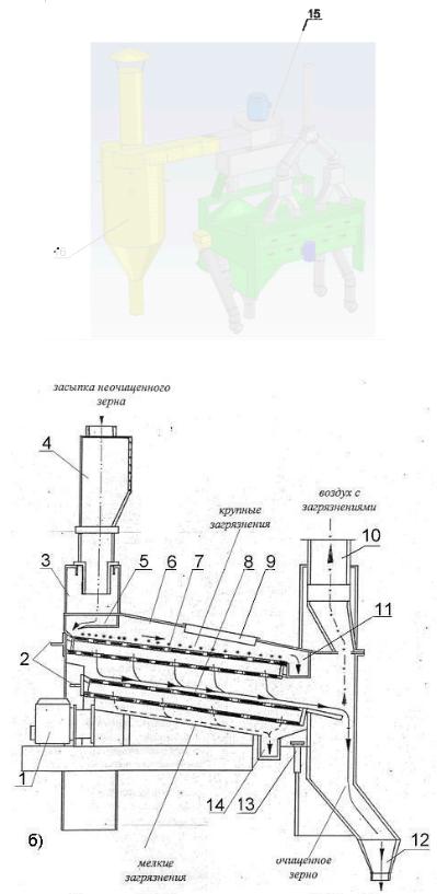 13 – ограничитель; 14 – желоб мелких примесей; 15 – вентилятор; 16 – циклон