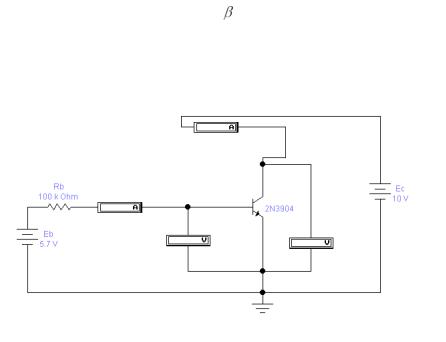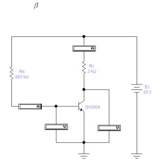 2.3.1 Открыть файл lw3_2.ewb со схемой, изображенной на рисунке 7. Включить схему. Записать результаты измерений для тока базы, тока коллектора, тока эмиттера, напряжения кол- лектор-эмиттер и напряжения на базе. Вычислить коэффициент передачи .