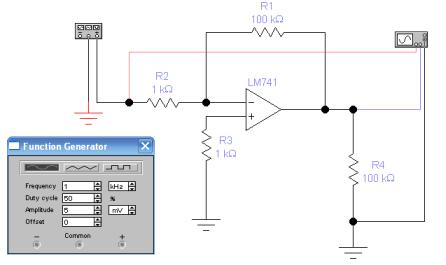 В схеме, приведенной на рисунке 1 уменьшите значение сопротивления R1 с 100кОм до 10кОм, амплитуду синусоидаль-