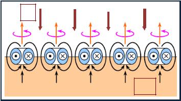 Рис.3. Механизм создания пониженного давления внутри металлического проводника разворотом вихревых эфирных воронок поверхностных атомов навстречу внешнему