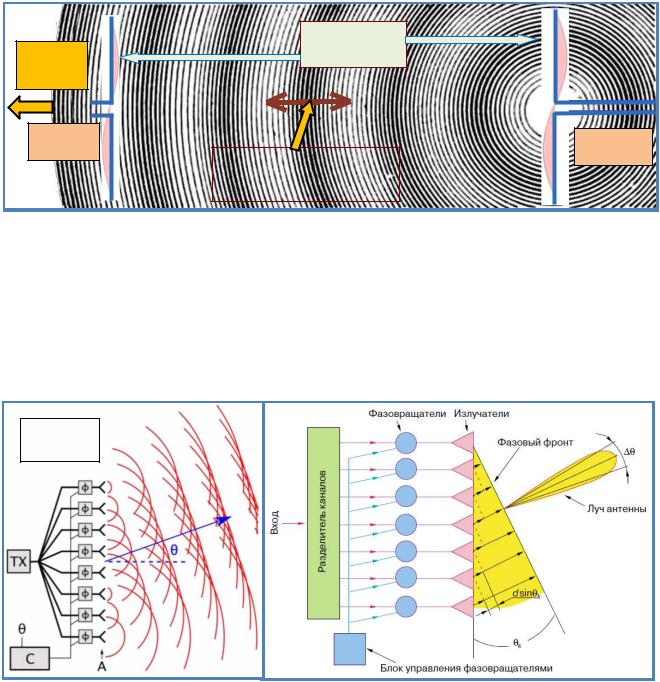 Рис. 50. Принцип излучения и управление направлением распространения и формой эфиродинамической волны путем изменения фазы для каждого элемента излучения FAR-антенны.