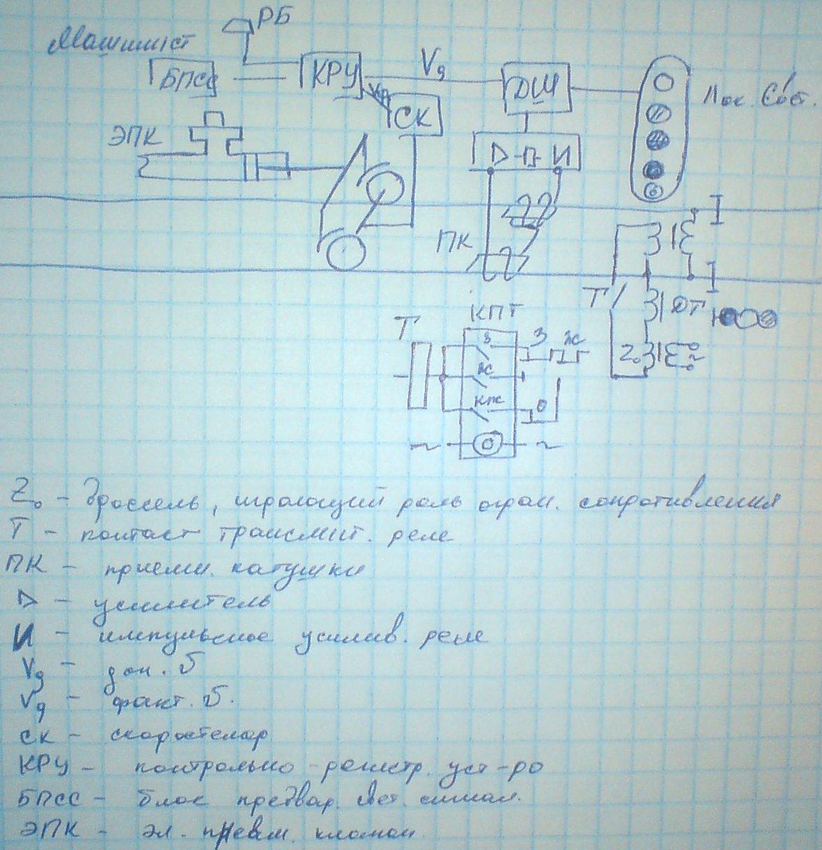 На основании поступившего кодового сигнала дешифратор формирует контролируемую скорость движения поезда. Контролируемая скорость - скорость которую поезд не должен превысить при проследовании светофора. В контрольном устройстве допустимая и контролируемая скорости сравниваются с фактической, которая поступает от скоростемера. При превышении поездом контролируемой скорости раздается сигнал и машинист должен подтвердить свою бдительность рукояткой бдительности. Пока поезд не снизил скорость до значения контролируемой, сигнал будет периодически раздаваться. Если машинист не подтверждает свою бдительность, срабатывает автоматический клапан и поезд автоматически останавливается.