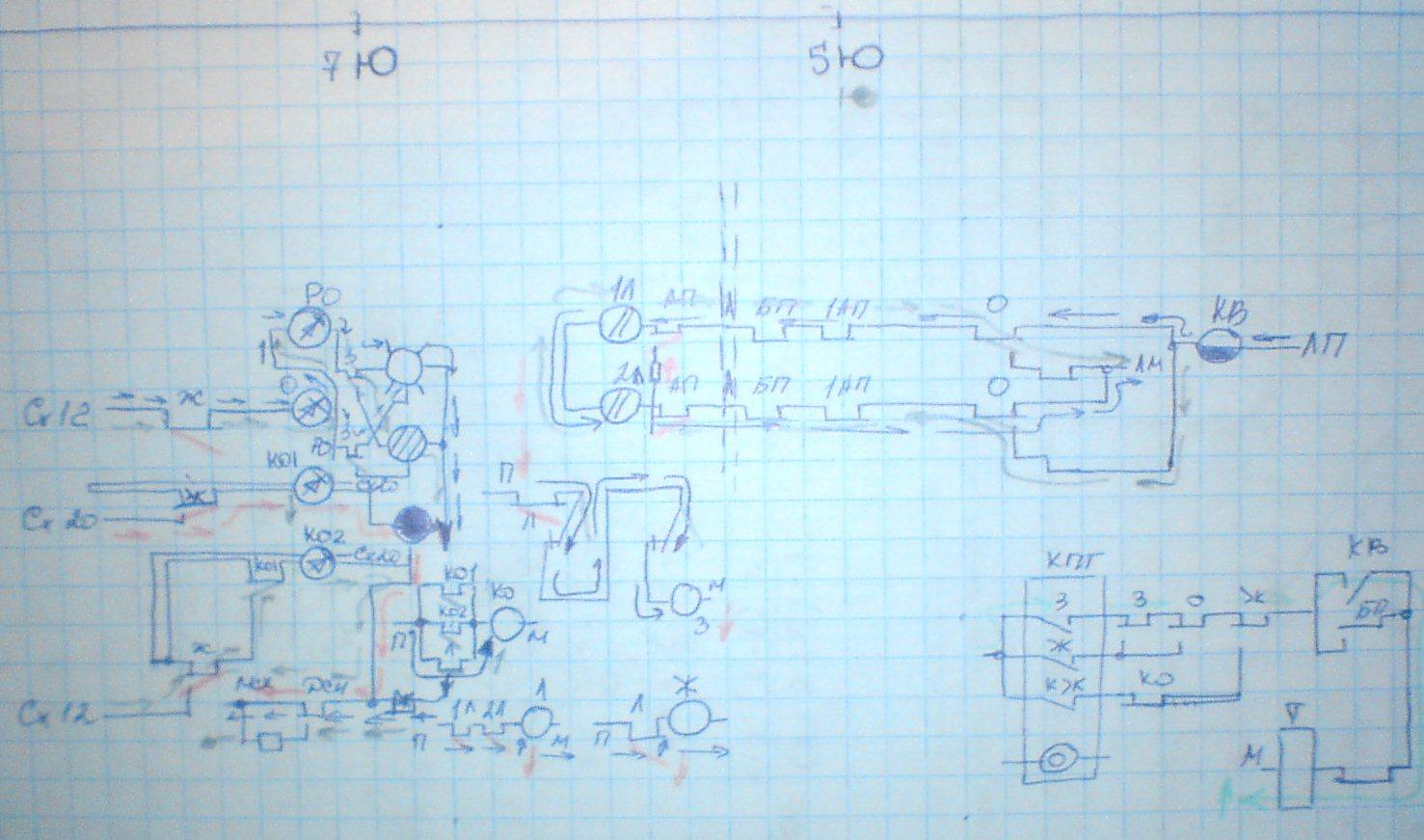 При отсутствии поезда на блок-участке 7 и разрешающем сигнале светофора 5 линейные реле 1Л и 2Л получаю питание тока прямой полярности, в результате срабатывают реле З и Ж и на светофоре 7 загорается зеленый сигнал. При запрещающем сигнале светофора 5, релейные реле 1Л и 2Л получают ток обратной полярности, реле З выключается и на светофоре загорается желтый. При появление поезда на участке 7, путевые реле выключаются (АП, БП, 1АП), линейные реле питания не получают, реле З и Ж выключаются, на светофоре 7 загорается красный.