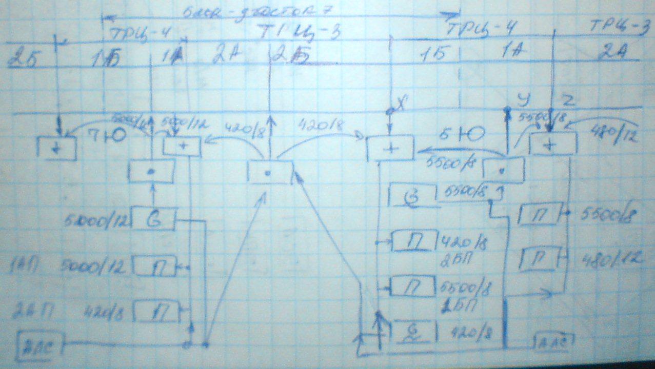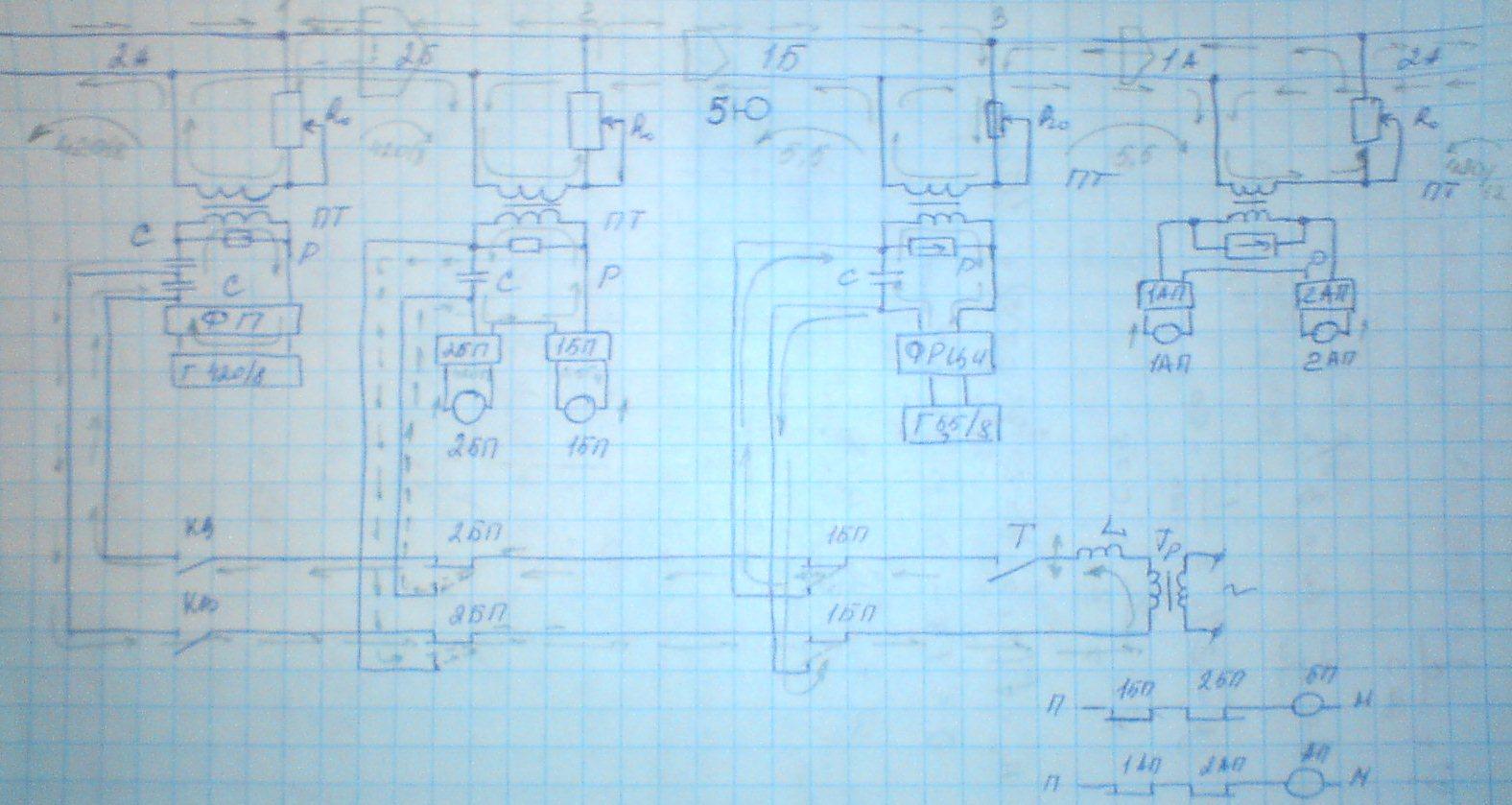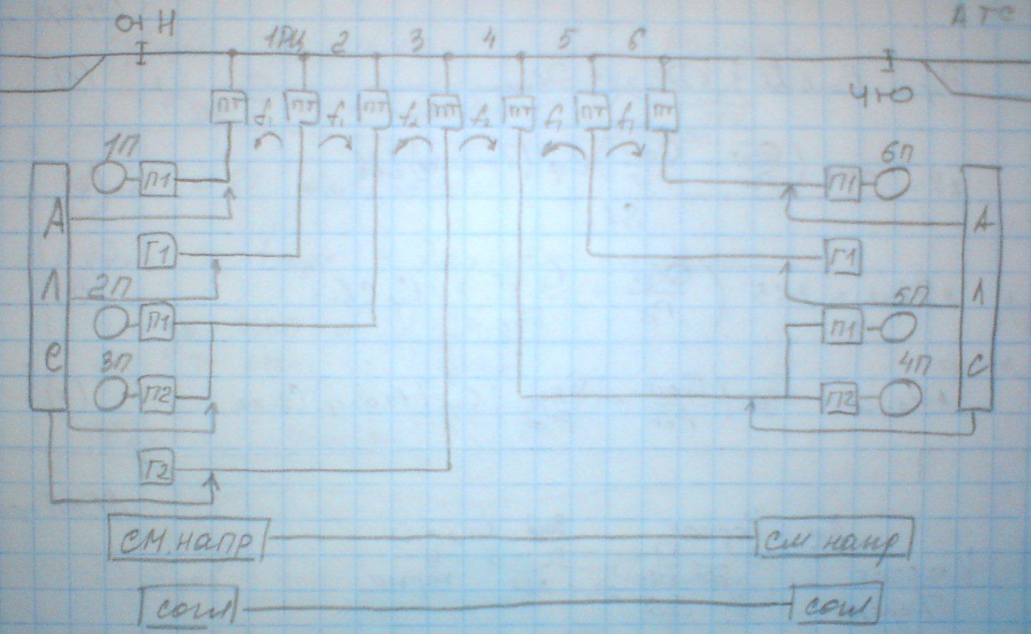 В середине второго участка между участками 2А и 2Б подключается генератор сигналы с частотой 420/8, подключение через электрический фильтр и путевой трансформатор. Электрический фильтр предназначен для того, чтобы в рельсовую цепь не попадали сигналы отличные от частоты 420Гц. У светофора 5 в точке Х через путевой трансформатор подключаются два приемника, один из которых настроен на частоту 420 а другой 5500 Гц. На выходах приемников установлены путевые реле: 2БП, контролирующее участок 2Б и путевое реле 1БП контролирующее участок 1Б. При появлении поезда на участке соответствующее путевое реле выключается. Служит для взаимной увязки сигналов светофоров и для переноса точки подключения АЛС. В точке У у светофора 5 подключается генератор ТРЦ-4 по краям стоят приемники. Сигнал от генератора проходит с помощью электрического фильтра и путевого трансформатора подключается к рельсовой цепи. При занятии соответствующего участка 1Б и 1А соответствующий приемник выключается, что приводит к размыканию контактов соответственного реле, изменению сигналов светофоров и перенесению точки передачи АЛС.