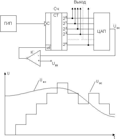 Эта схема отличается от схемы преобразователя предыдущего типа тем, что в ней используется реверсивный счетчик Сч, управляемый сигналами с выхода компаратора К. При Uвх > Uос счетчик устанавливается в режим прямого счета, поступающие на вход импульсы генератора ГИП последовательно увеличивают в нем число, растет напряжение Uос, до уровня напряжения Uвх. При Uвх < Uос счетчик переводится в режим обратного