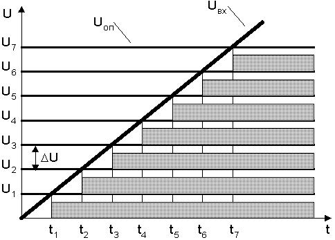 АЦП параллельного типа содержит делитель, состоящий из набора последовательно включенных резисторов с одинаковым сопротивлением R, компараторов К и кодирующей логики. На один из входов каждого компаратора подается опорное напряжение Uоп, снимаемое с делителя, причем эти напряжения отличаются друг от друга на величину ∆ U (см. рисунок 2.7). Вторые входы компараторов объединены и на них подано входное напряжение Uвх. Работу АЦП данного типа можно рассмотреть по диаграмме, изображенной на рисунке 2.7. При достижении входным напряжением значения опорного напряжения первого компаратора U1 (момент времени t1) последний срабатывает и подает сигнал активного уровня со своего выхода на первый вход устройства кодирующей логики, на выходе которого при этом появляется число "1" в двоичном коде. При дальнейшем возрастании входного напряжения в момент времени t2 сработает второй компаратор и на выходе АЦП появится "2" и т.д. В данном случае значение ∆ U представляет собой шаг квантования.