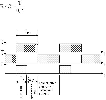 Блок управления формирует импульсы, управляющие работой аналогового порта ввода. Временные диаграммы работы БУ представлены на рисунке 2.10. Целью расчета БУ является определение частот одновибратора и ГТИ для выбора параметров их времязадающих элементов. Времязадающими элементами одновибратора и ГТИ являются резистор и конденсатор, подключаемые к соответствующим выводам микросхем, на которых они собраны. Параметры резистора и конденсатора подбираются по номинальным значениям из справочной литературы [4, 5] исходя из условия (для микросхем К155 АГ1 или К555 АГ1)