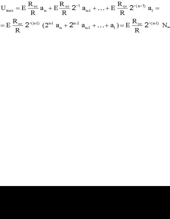 Если в состоянии "1" находятся одновременно триггеры нескольких разрядов, то напряжение на выходе усилителя равно сумме напряжений, передаваемых на этот выход от отдельных триггеров. Пусть цифры отдельных разрядов двоичного числа в регистре – аn, аn-1, ... , а1. Тогда напряжение на выходе усилителя
