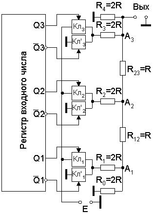 Нетрудно построить схему с любым заданным числом разрядов. Особенности этой схемы состоят в том, что, во-первых, используются резисторы лишь с двумя значениями сопротивлений (R и 2R) и, во-вторых, выходные напряжения триггеров непосредственно не участвуют в формировании выходного напряжения ЦАП, а используются лишь для управления состоянием ключей, т.е. устранены отмеченные выше недостатки предыдущей схемы ЦАП (см. рисунок 3.1).