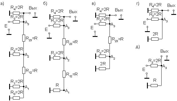 Если в регистр поместить число 0102, то аттенюатор можно представить схемой, показанной на рисунке 3.4, а. Путем преобразования ее можно привести к схеме, представленной на рисунке 3.4, в.