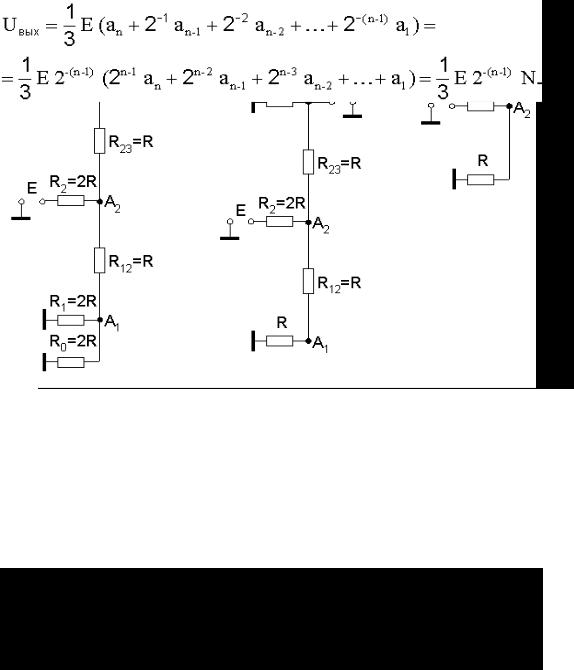 Можно показать, что при числе 0012 напряжение в точке A1 UА1= E/3. При передаче этого напряжения в точку А2 и далее от точки А2 к точке А3 напряжение каждый раз делится на два и Uвых = 0,25 Е / 3.