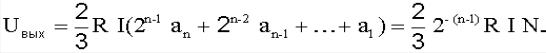 Итак, напряжение на выходе, соответствующее единицам отдельных разрядов двоичного числа в регистре, пропорционально весовым коэффициентам разрядов. При n-разрядном регистре, обозначив цифры разрядов двоичного числа аn, аn-1, ... , а1, получим выражение напряжения на выходе ЦАП: