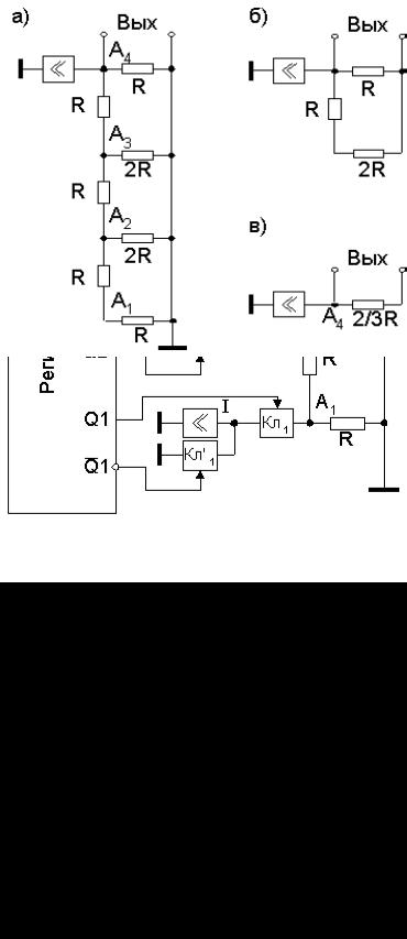 стабильного тока I. Если триггер регистра входного числа находится в состоянии "1", ток I источника через открытый ключ втекает в аттенюатор сопротивлений; если триггер в состоянии "0", то открывается другой ключ, который замыкает источник. На рисунке 3.7, а показана схема, соответствующая числу 10002. Путем преобразований она приводится к эквивалентным схемам на рисунках 3.7, б и 3.7, в, откуда следует