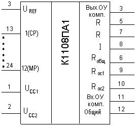 R ОС2; 11 – вход ОУ компенсации; 12 – общий; 13 цифровой вход 1 (СР); 14 – 23 – цифровые входы 2 – 11; 24 – цифровой вход 12 (МР).