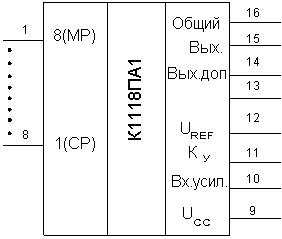 Нумерация и назначение выводов микросхемы: 1 – цифровой вход 8 (МР); 2 – 7 – цифровые входы 2 – 7; 8 – цифровой вход 1 (СР); 9 – напряжение источника питания; 10 – инвертирующий вход усилителя; 11 – коррекция усилителя; 12 – опорное напряжение; 13 – неиспользуемый вывод; 14 – выход; 15 – выход дополняющий; 16 – общий.