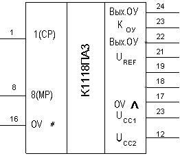 Нумерация и назначение выводов микросхемы: 1 – цифровой вход 1 (СР); 2 – 7 – цифровые выходы 2 – 7; 8 – цифровой вход 8 (МР); 12 – напряжение источника питания UCC1; 13 – напряжение источника питания UCC2; 16 – общий цифровой; 17 – общий аналоговый; 18 – аналоговый выход (прямой); 19 – аналоговый выход (инверсный); 21 – выход ИОН; 24 – прямой выход ОУ; 9 – 11, 14, 15, 20 – незадействованные выводы.