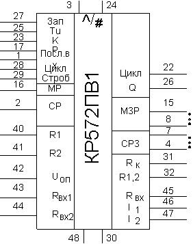 Нумерация и назначение выводов (для КР572ПВ1 в скобках): 1 – последовательный вход; 2 – вход управления СР; 3 – напряжение питания UСС1; 4 – 15 – цифровой вход – выход (от СР к МР); 16 – вход управления МР; 17 – вход управления режимом; 22(18) – выход Цикл; 23(19) – вход сравнения; 24(20)