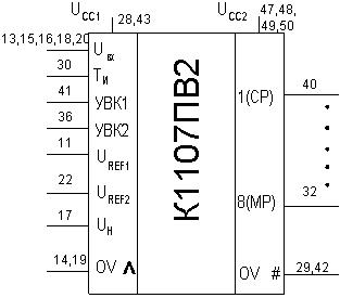 Полупроводниковая БИС 8-разрядного быстродействующего АЦП считывания типа К1107ПВ2 (рисунок 10) выполняет преобразования входного напряжения, изменяющегося в диапазоне от –2 В до 0, в один из видов цифрового кода: двоичного (прямого или обратного) или дополнительного (прямого или обратного).