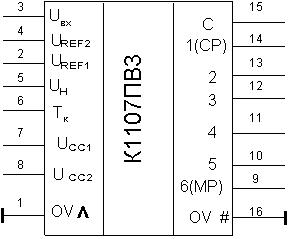 Нумерация и назначение выводов микросхемы: 1 – общий (аналоговая земля); 2 – опорное напряжение UREF1; 3 – аналоговый вход; 4 – опорное напряжение UREF2; 5 – напряжение контроля гистерезиса UH; 6 – вход тактовых импульсов; 7 – напряжение источника питания UCC1; 8 – напряжение источника питания UCC2; 9 – цифровой выход 6 (МР); 10–13 – цифровые выходы 5–2; 14 – цифровой выход 1 (СР); 15 – цифровой выход 7 (РП); 16 – общий (цифровая земля).