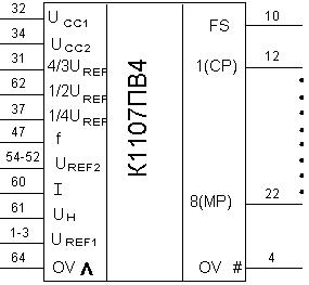 30 – тактовый сигнал; 32 – цифровой выход 8 (МР); 33–35 цифровые выходы 7 – 5; 36 – управление выходным кодом (вход 2); 37–39 – цифровые выходы 4–2; 40 – цифровой выход 1 (СР); 41 – управление выходным кодом (вход 1); 47–50 – напряжение источника питания UСС2; 1 – 10, 12, 21, 23 – 27, 31, 44 – 46, 51 – 64 – незадействованные выводы.