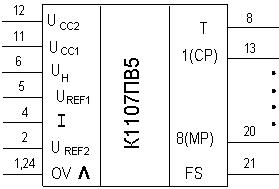 Нумерация и назначение выводов микросхемы: 1 – общий (аналоговая земля); 2 – опорное напряжение UREF1; 4 – аналоговый вход; 5 – опорное напряжение UREF2; 6 – напряжение контроля гистерезиса UН; 8 – вход импульсов; 11 – напряжение источника питания UCC1; 12 – напряжение источника питания UCC2; 13 – цифровой выход 1 (МР); 16–19 – цифровые выходы 2–5; 20 – цифровой выход 6 (СР); 21 – выход разряда переполнения; 24 – общий (аналоговая земля); 3, 7, 9, 10, 14, 15, 22, 23 –