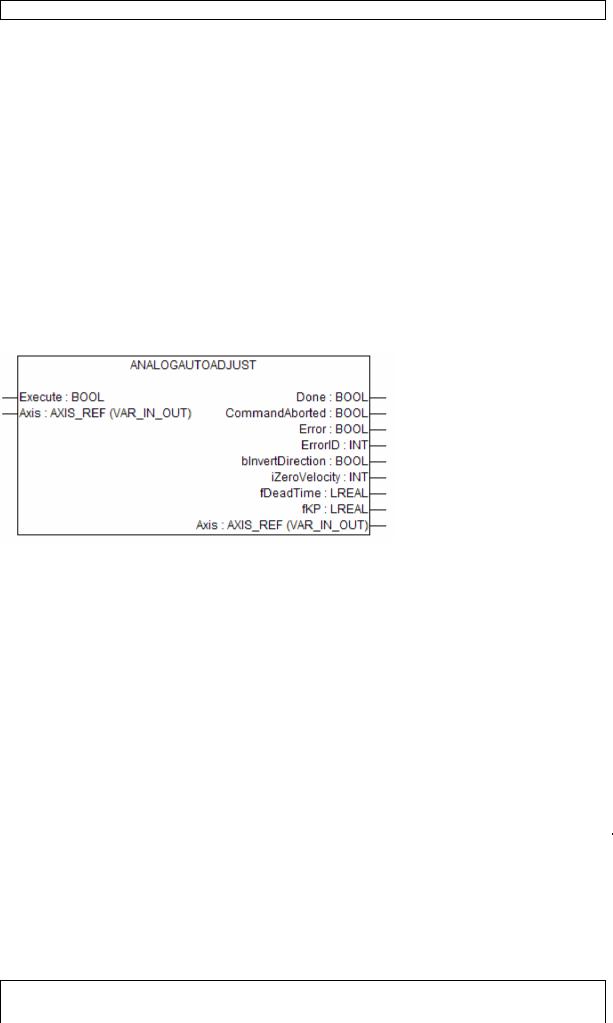 This function block runs the motor and automatically adjusts the controller parameters bInvertDirection, iZeroVelocity, fDeadTime, fKp. It must be handled with care as the drive may act instable during this procedure and move quickly.