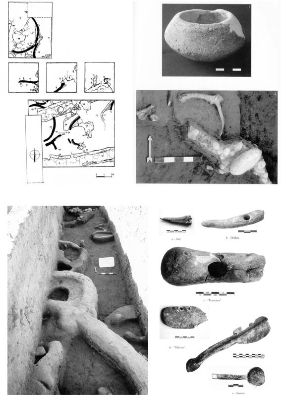 Figure 4. 1. Small carinated vessel from Level II (middle level of the blur) ; 2. Antler and stucture of pebbles in Level II, Aratashen.