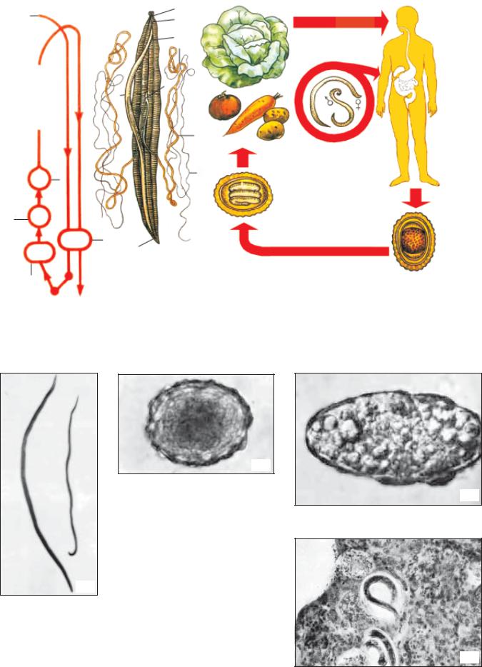 Тонкий головной конец червя погружен в слизистуюоболочкукишечникадляфиксацииипитания(рис. 30.4). Питается кровью и клетками стенки кишечника. Зрелая самка откладывает в просвет кишечника яйца, которые попадают во внешнюю среду с фекалиями больного. Свежевыделенные яйца не инвазионны, созревают от 2 недель до 3–4 месяцев в зависимости от температуры и влажности окружающей среды (при 24 °С — 4 недели). Яйца сохраняют жизнеспособность 1–2 года. Человек заражается через загрязненные продукты питания, воду либо через грязные руки.