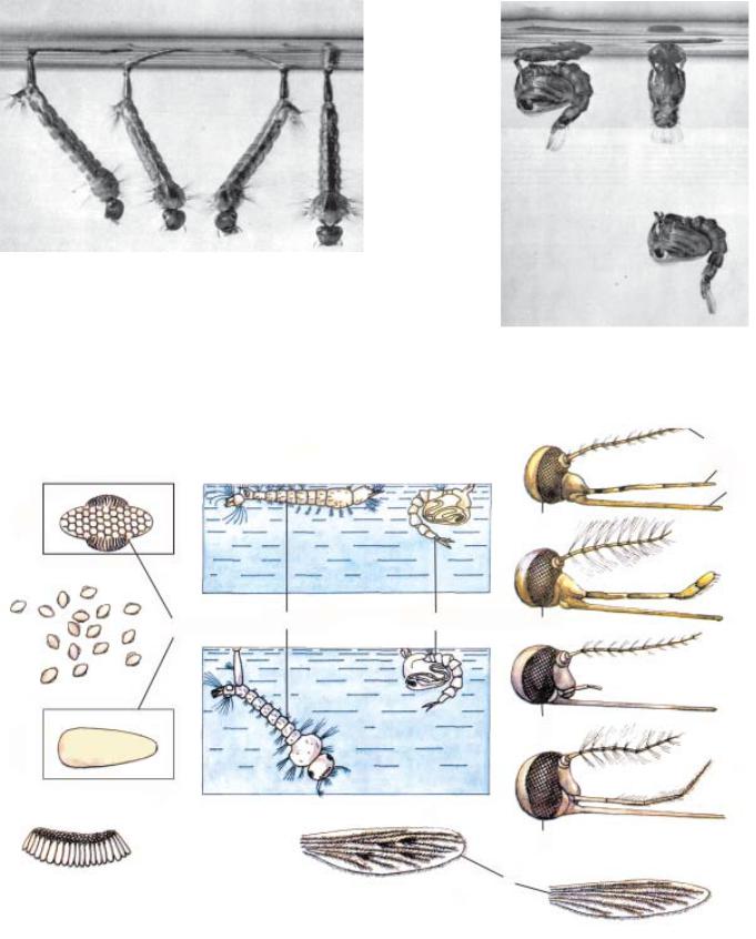 А — малярийный комар (Anopheles maculipennis); Б — немалярийный комар (Culex pipiens); 1 — яйцо;